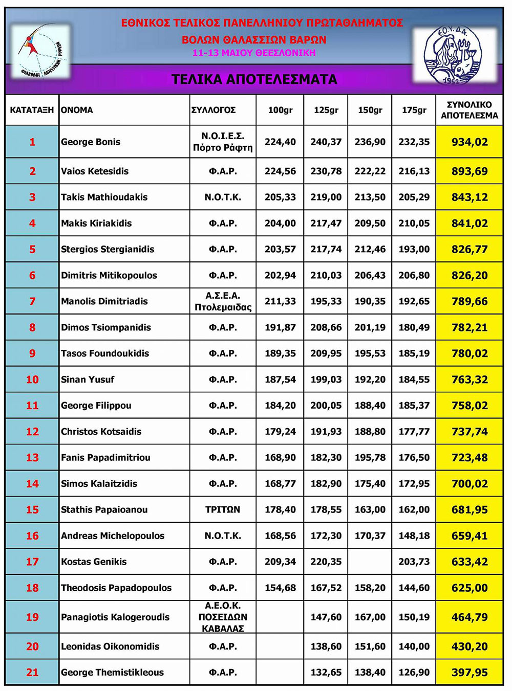 ΑΠΟΤΕΛΕΣΜΑΤΑ ΒΟΛΩΝ ΘΑΛΑΣΣΙΩΝ ΒΑΡΩΝ
