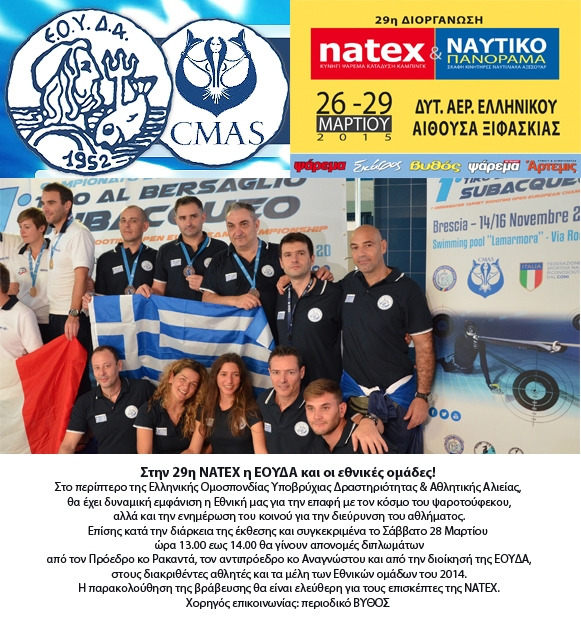 Στο περίπτερο της ΕΟΥΔΑ θα έχει δυναμική εμφάνιση η Εθνική μας για επαφή με τον κόσμο του ψαροτουφεκου αλλά και την ενημέρωση του κοινού για την διεύρυνση του αθλήματος.